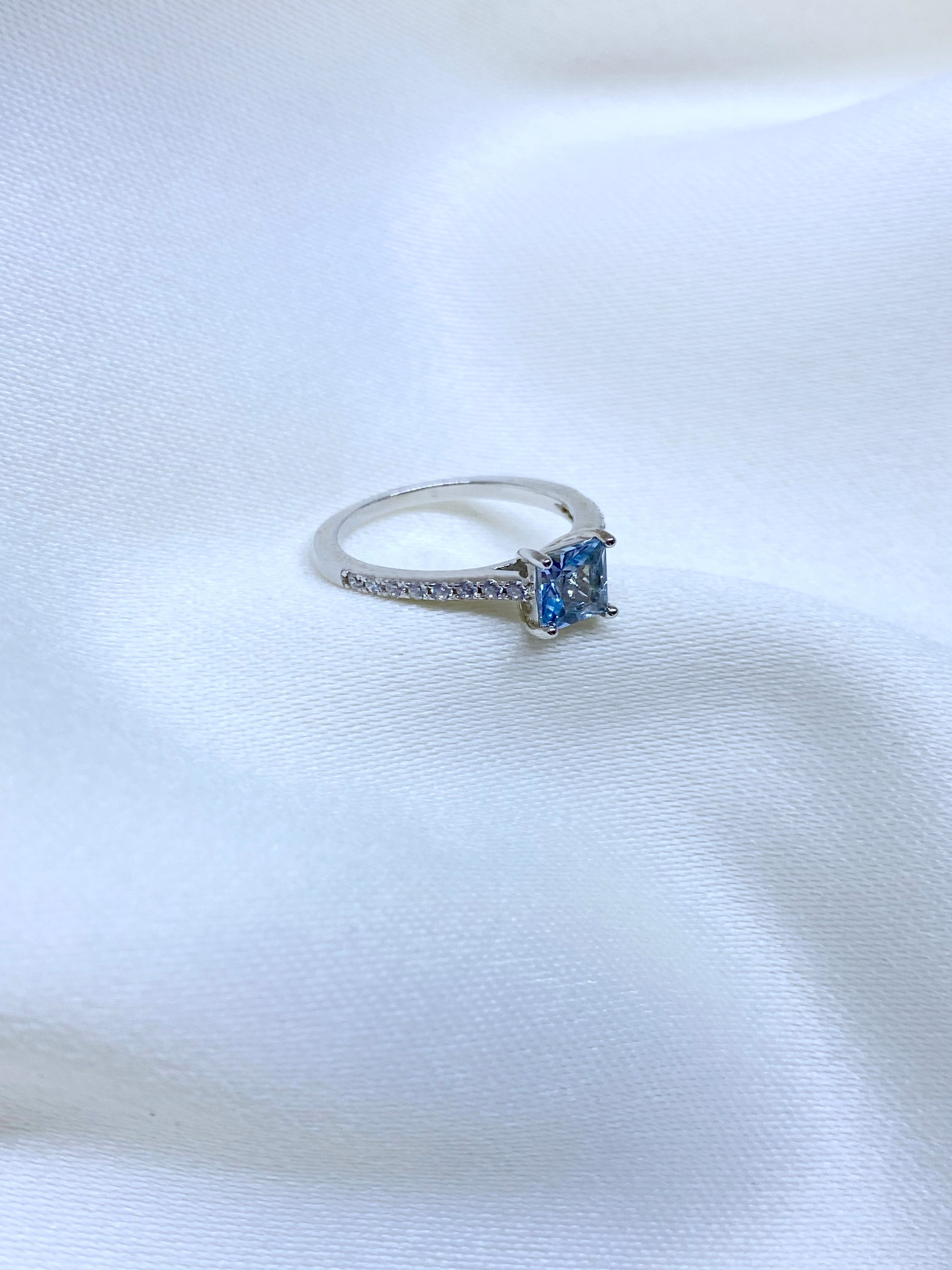 Anillo de Plata 925 con piedra principal topacio color celeste claro y circonias laterales.