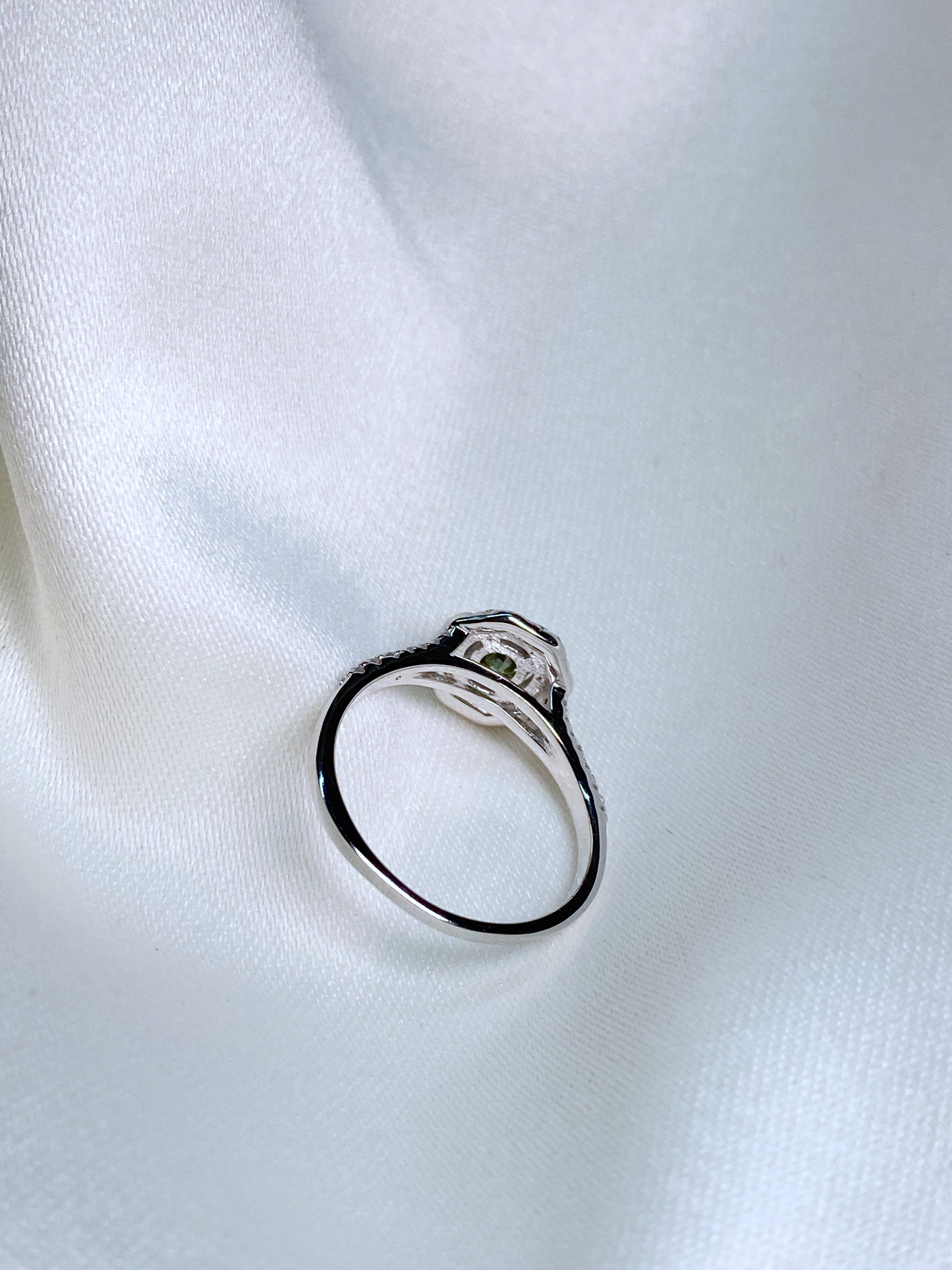 Anillo de Plata 925 con piedra principal Moissanita cyan rodeada de circonias.