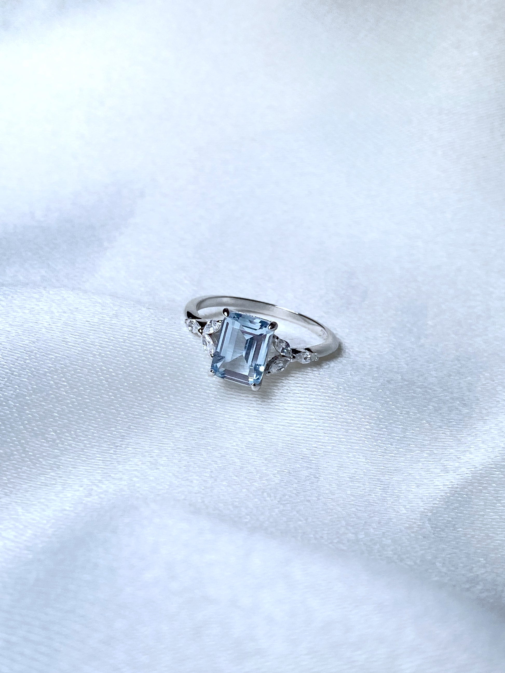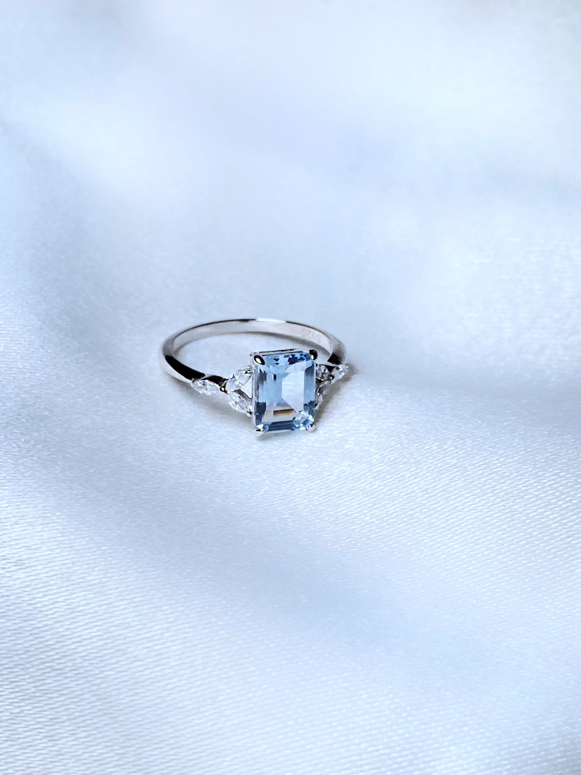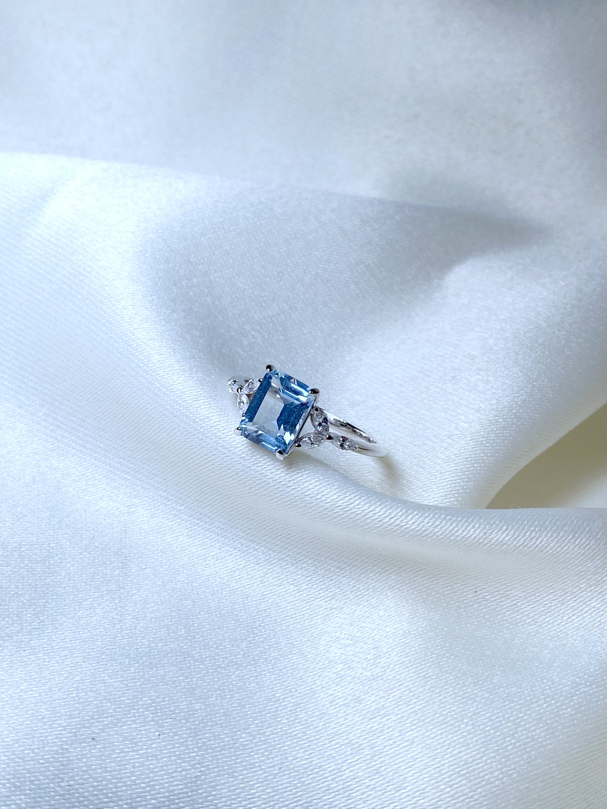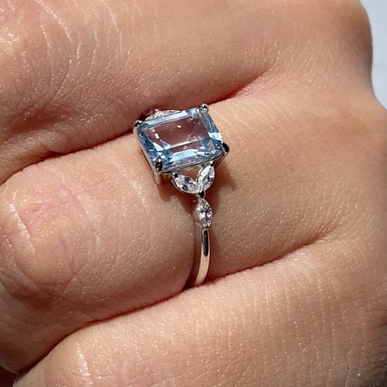 Anillo de Plata 925 con piedra central color celeste, corte esmeralda rodeada de circonias.