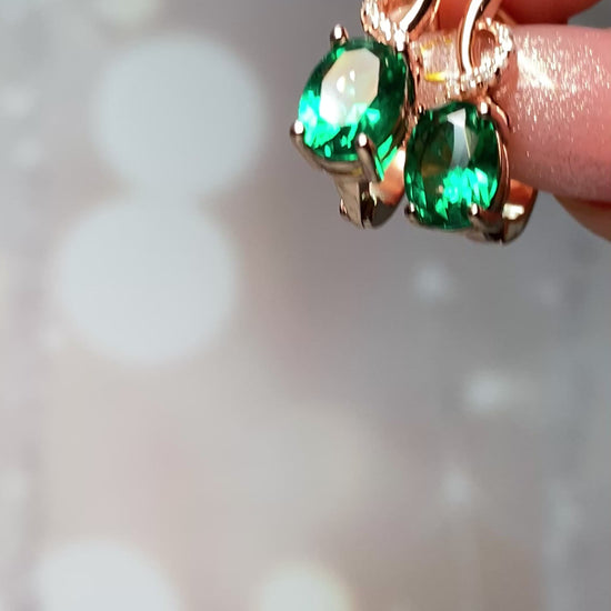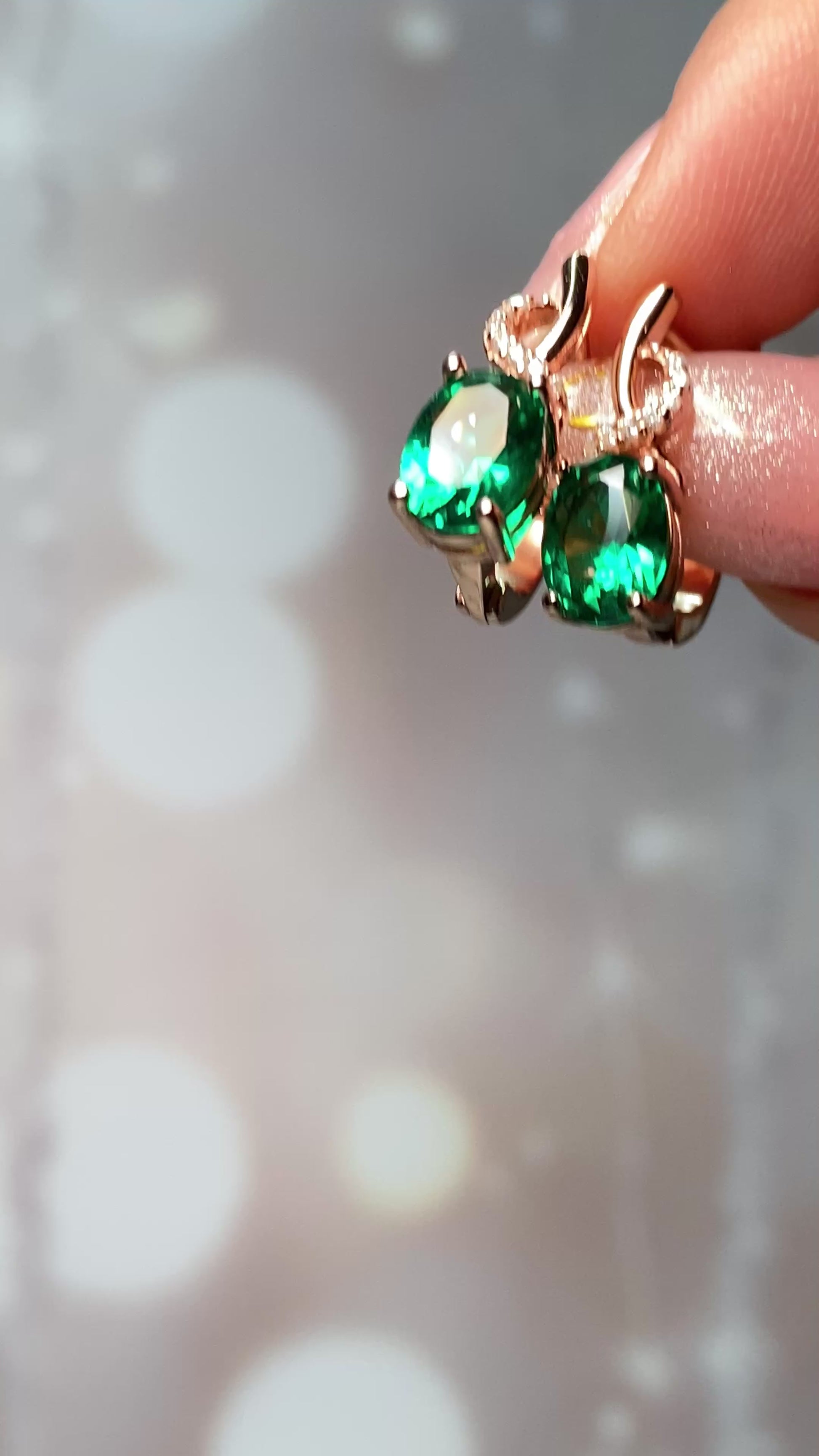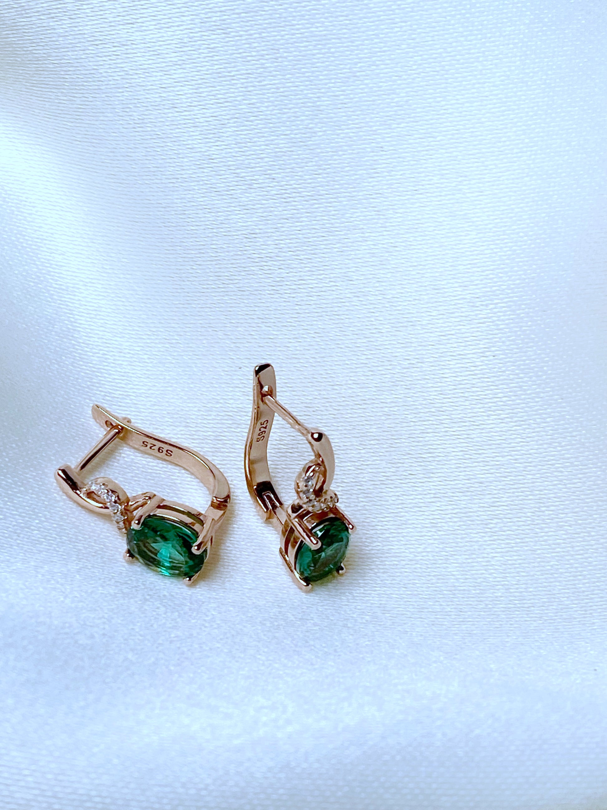Aretes de Plata 925 chapados en oro rosa 14K, piedra principal color verde, corte ovalado con circonias blancas laterales.
