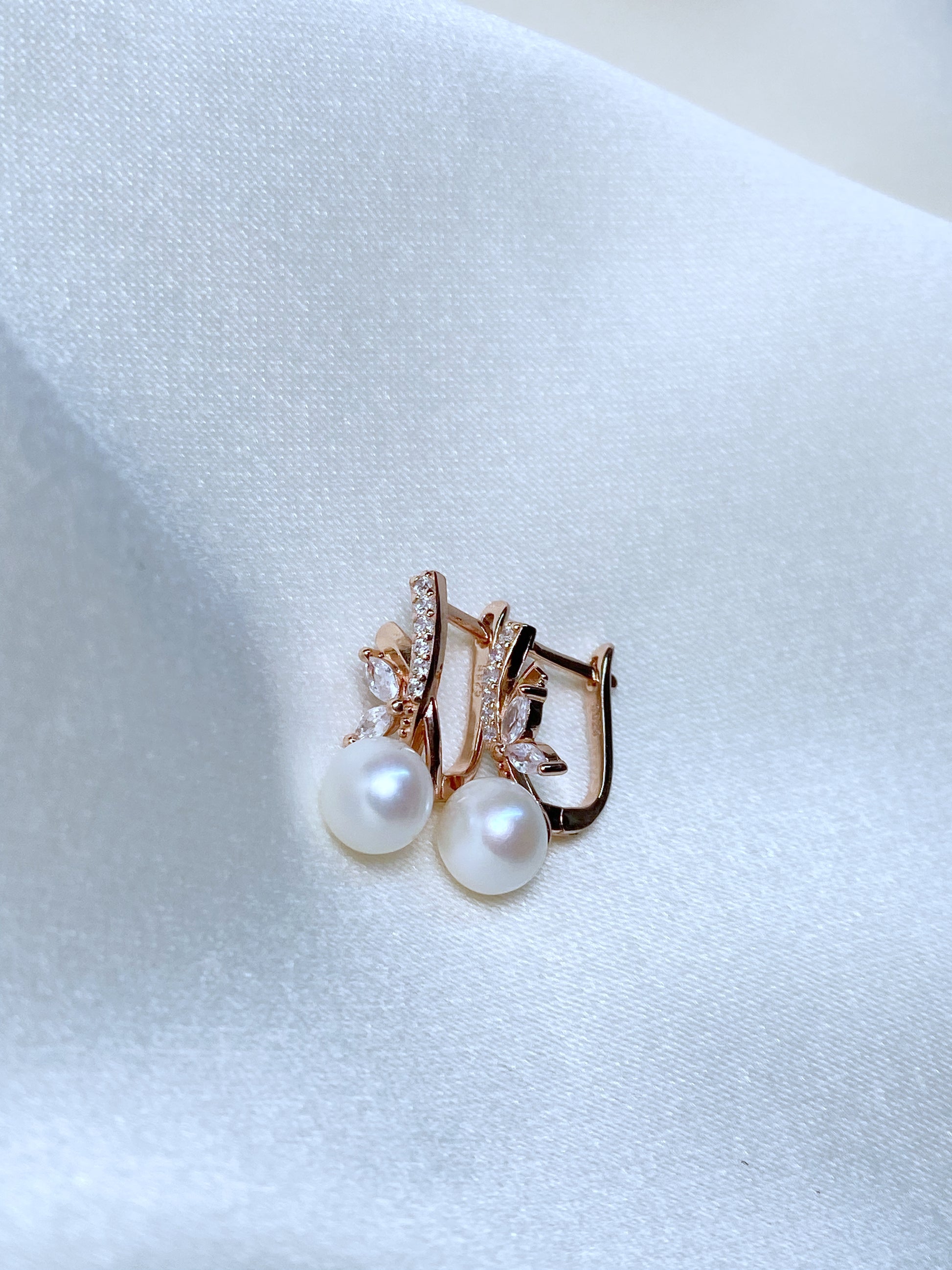 Aritos de Plata 925 chapados en oro rosa 14k con Perla cultivada y circonias laterales.