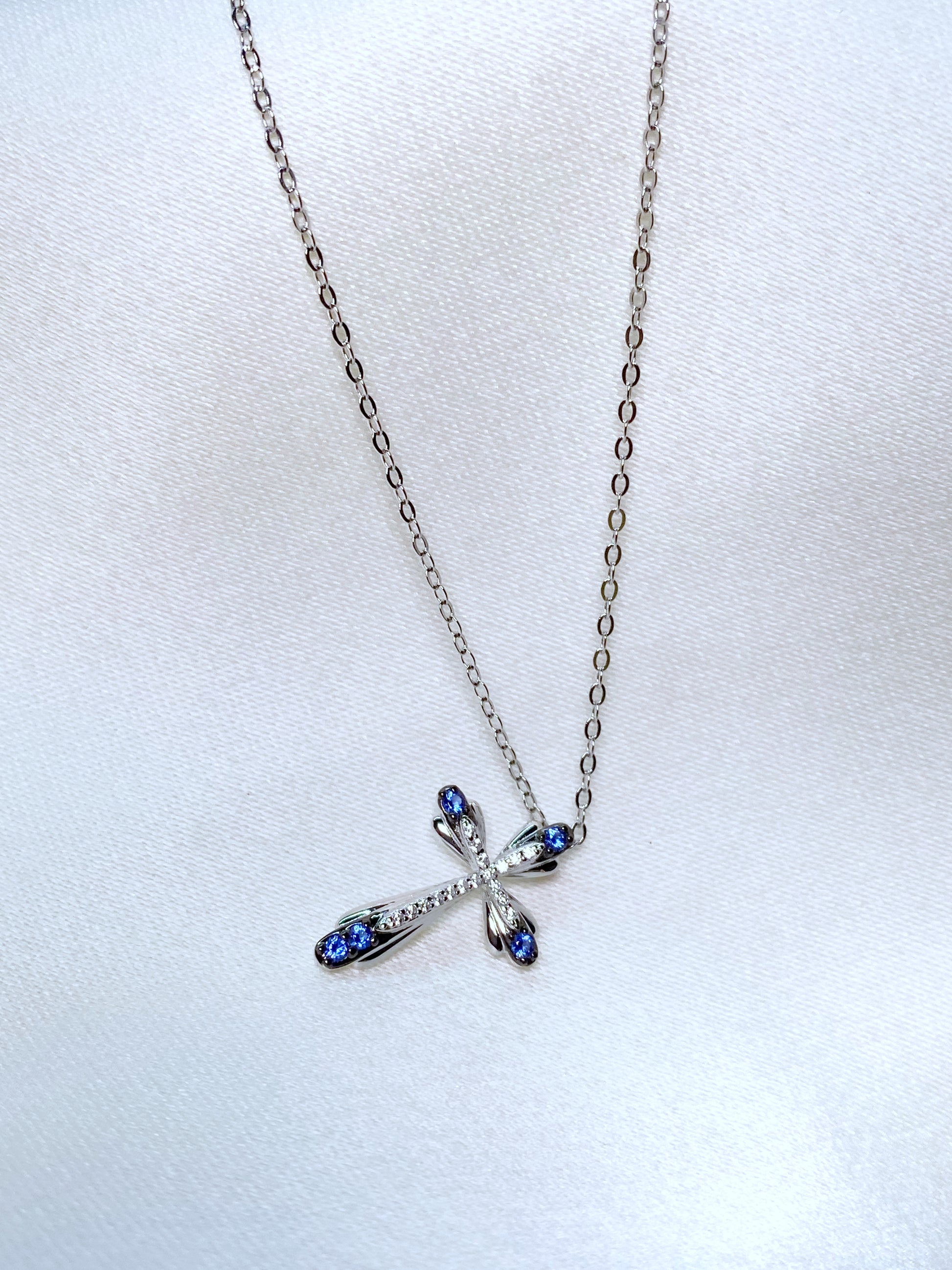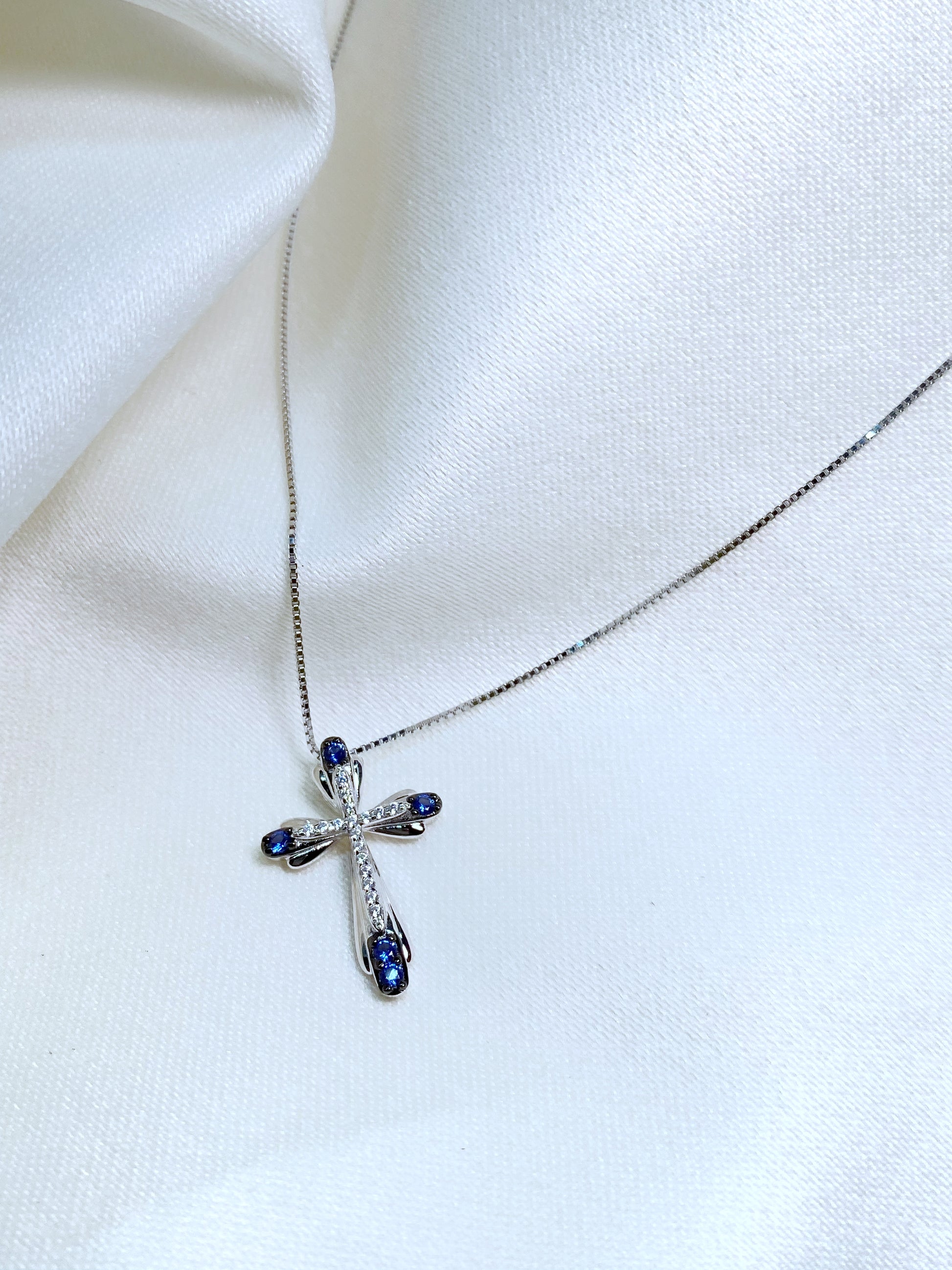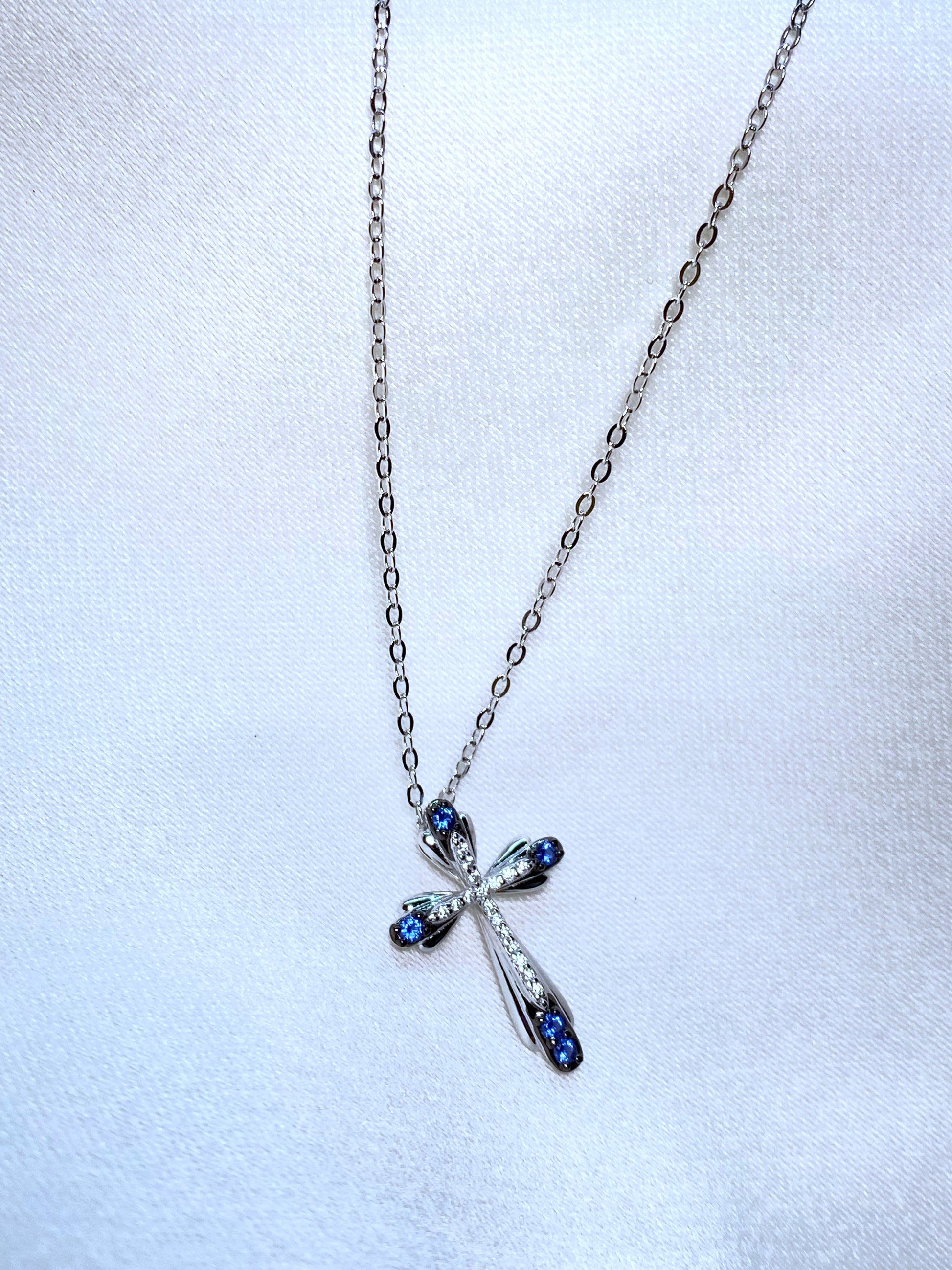 Cadenita de Plata 925 con dije en forma de cruz con circonias blancas y azules.