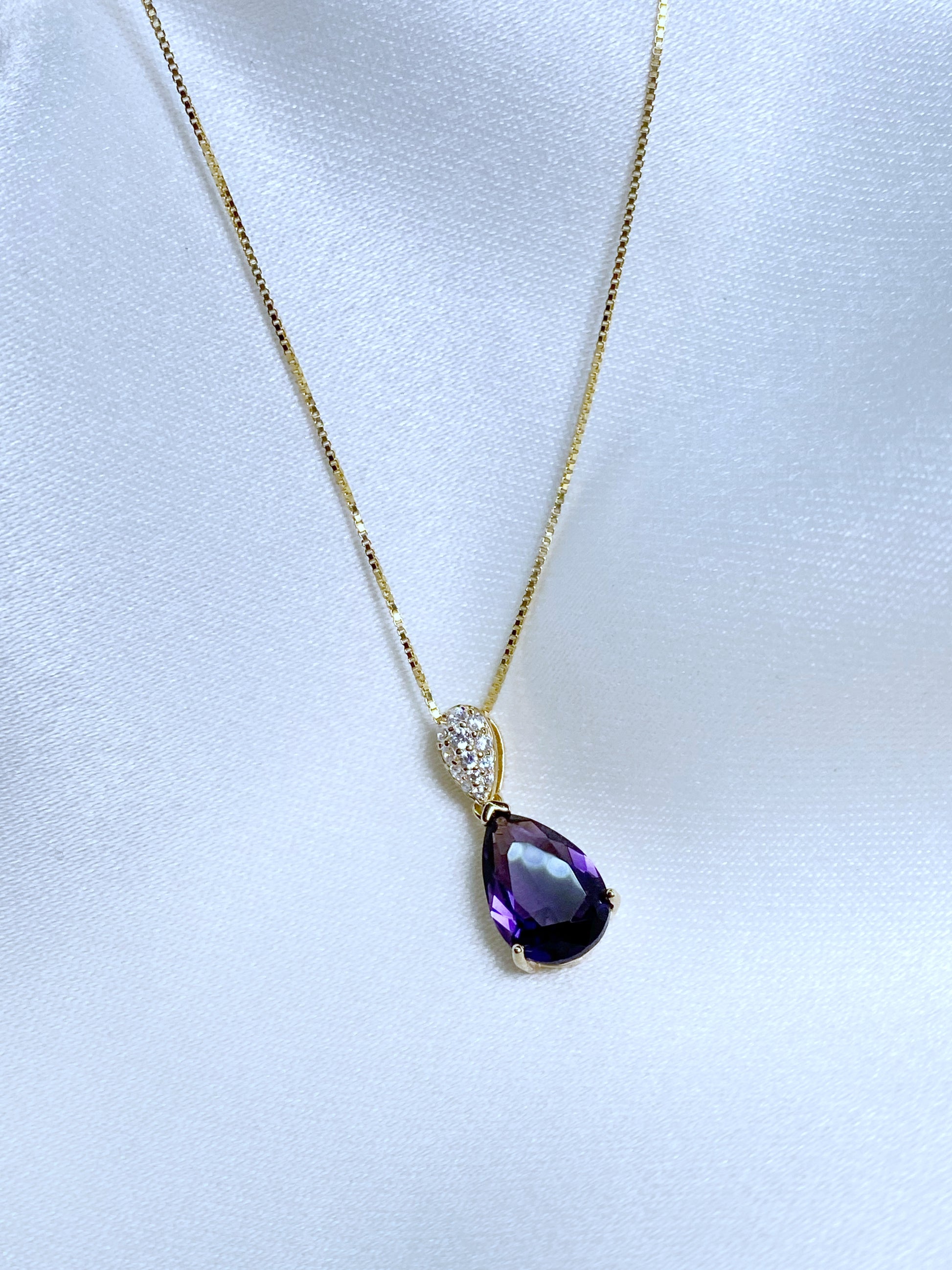 Cadena de Plata 925 chapada en oro, dije en corte pera color morado oscuro. Medida cadenita: 45 cm