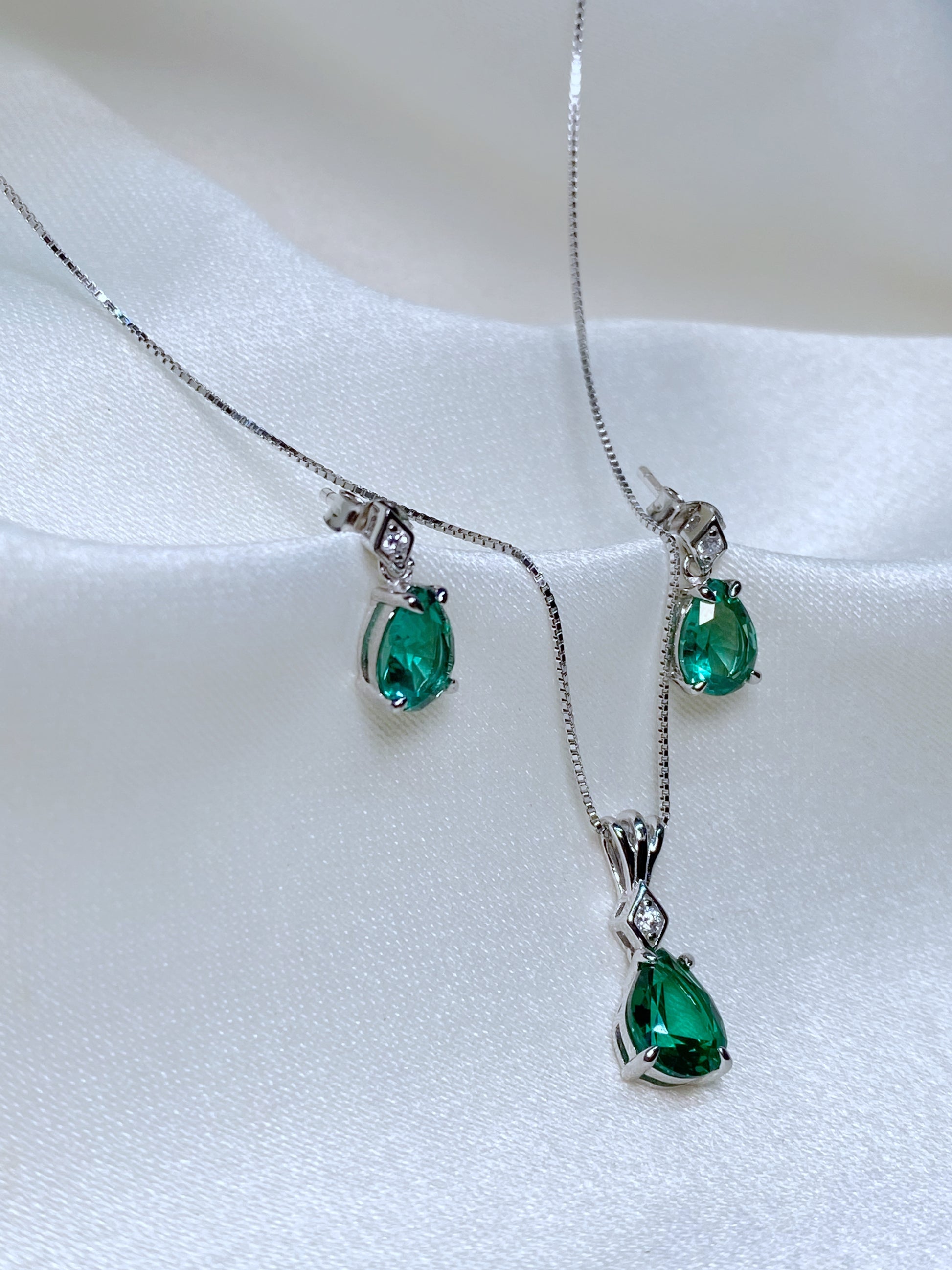 Conjunto de Plata 925 con piedritas circonias color esmeralda y piedras corte pera.